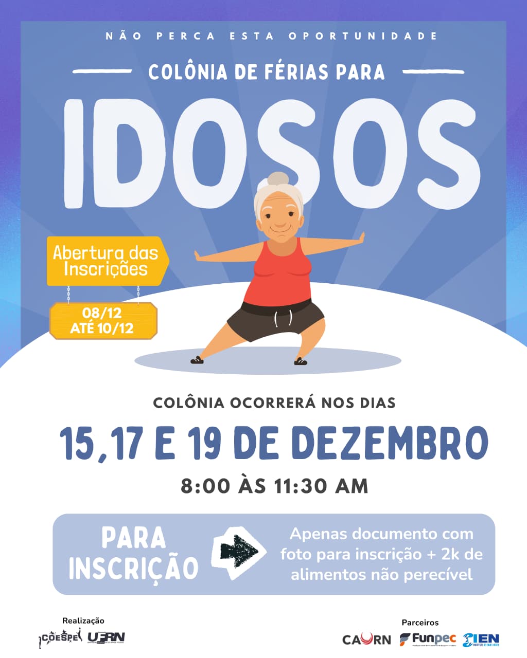 Com atividades especialmente pensadas para o público idoso, o Complexo de Esportes e Eventos da UFRN (Coespe), em parceria com a Caixa Assistencial Universitária do Rio Grande do Norte (CAURN) e o Instituto Envelhecer (IEN), realizará a Colônia de Férias para Idosos nos dias 15, 17 e 19 de dezembro. As inscrições poderão ser feitas presencialmente até o dia 10 de dezembro, para pessoas com 60 anos ou mais, no Ginásio 1 da UFRN.